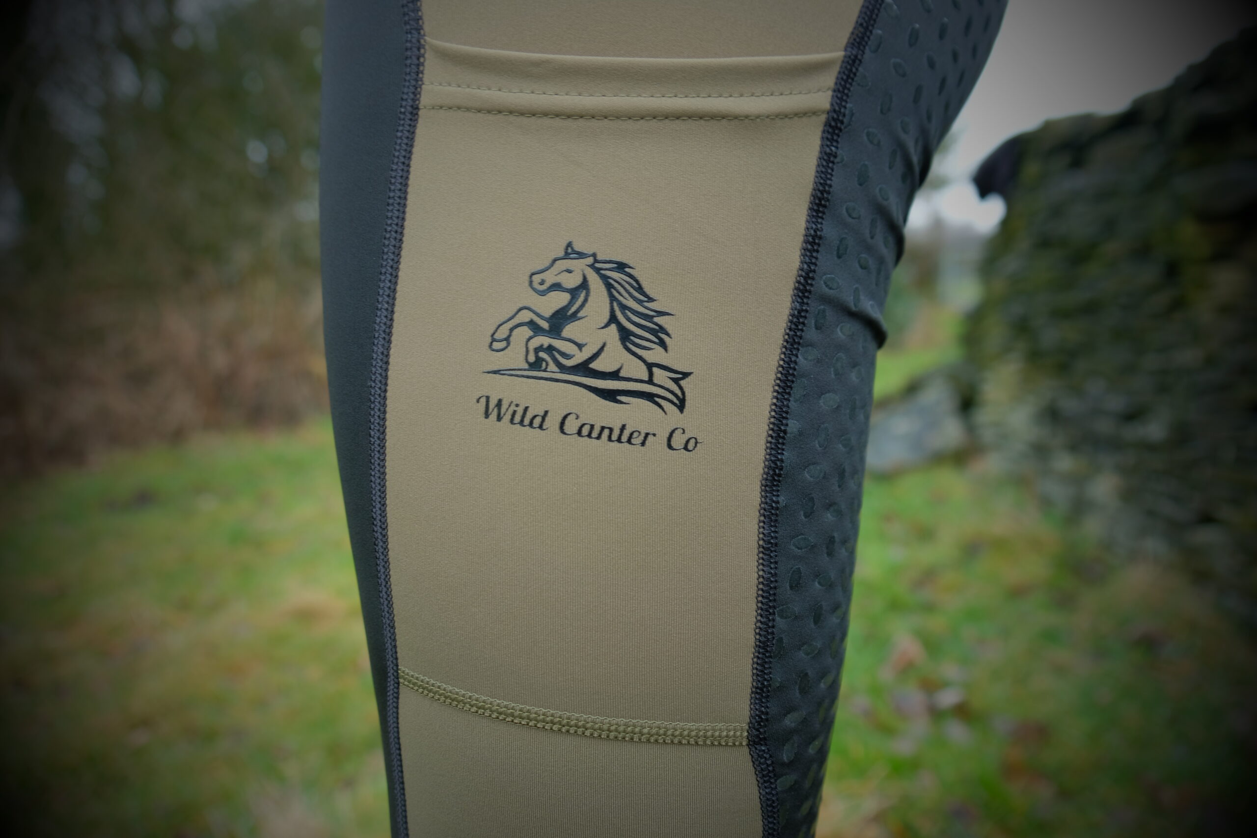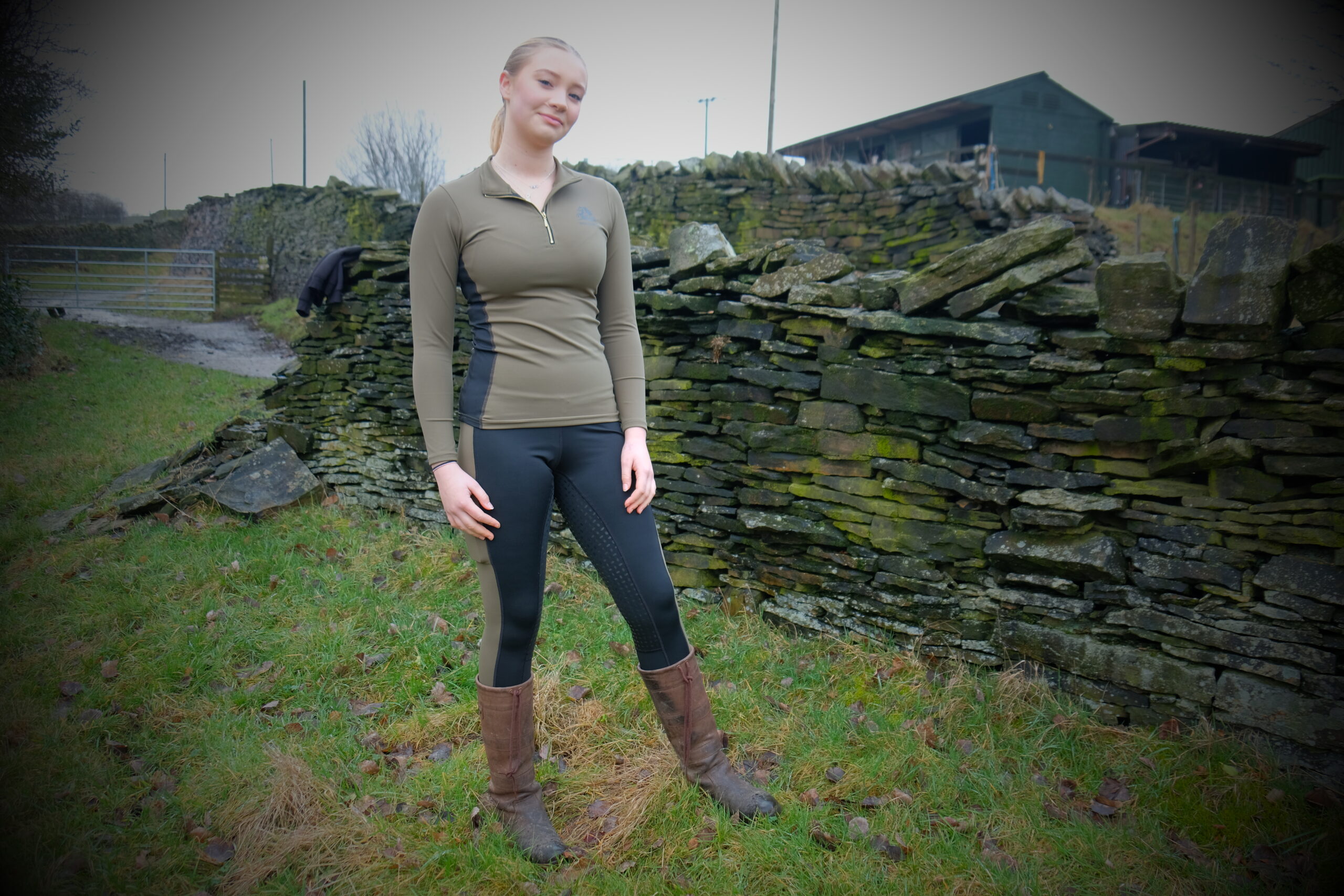 The deep olive tone is paired with sleek black accents for a timeless, flattering look that works effortlessly with your existing wardrobe. A high-waisted fit offers gentle support and a streamlined silhouette, while the breathable, quick-dry material keeps you comfortable throughout long days at the yard.